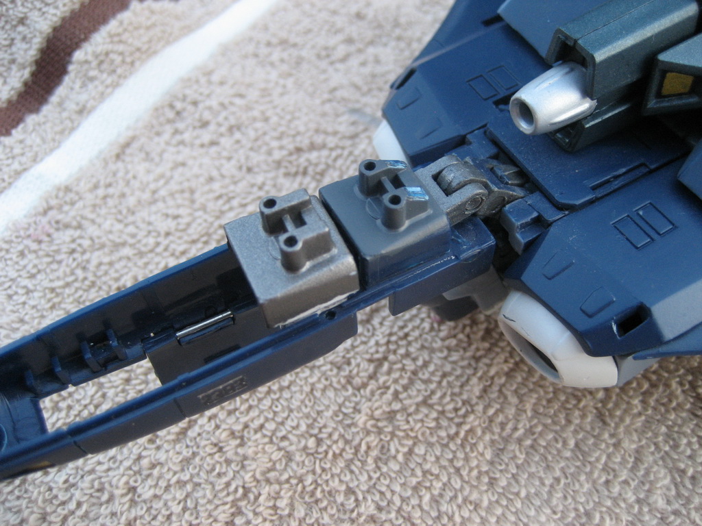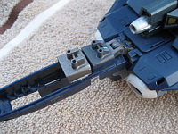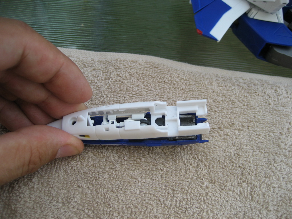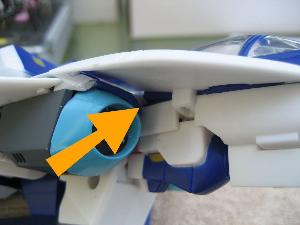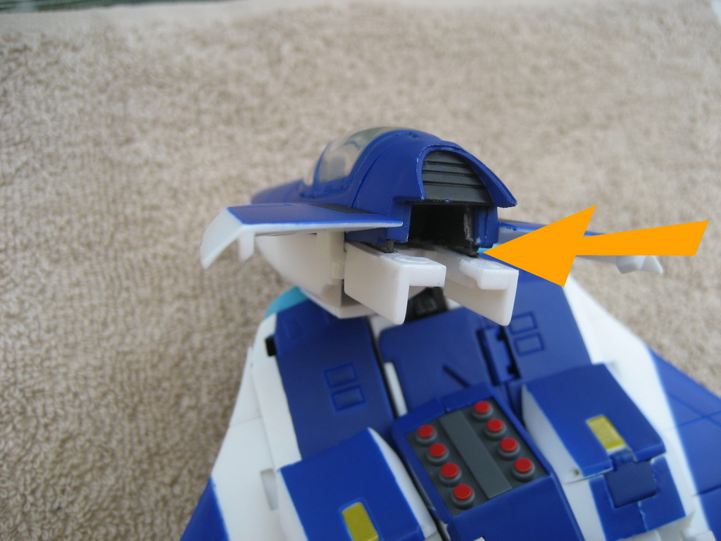 *** NOTE: par expérience, je me suis aperçu qu'il n'est pas nécessaire de chercher à trop plaquer le bloc gris, je conseille de faire des essais: Mettre la partie supérieure du cockpit, serrez avec les doigts et essayez d'ouvrir la verrière du cockpit pour tester: Elle doit s'ouvrir sans trop forcer et doit pouvoir rester ouverte. Si malgré que le bloc gris soit bien plaqué et que la verrière force pour s'ouvrir, alors vous pourriez avoir recours au rabotage qui existe sur les Toynami mais normalement, ce n'est pas nécessaire. ***