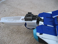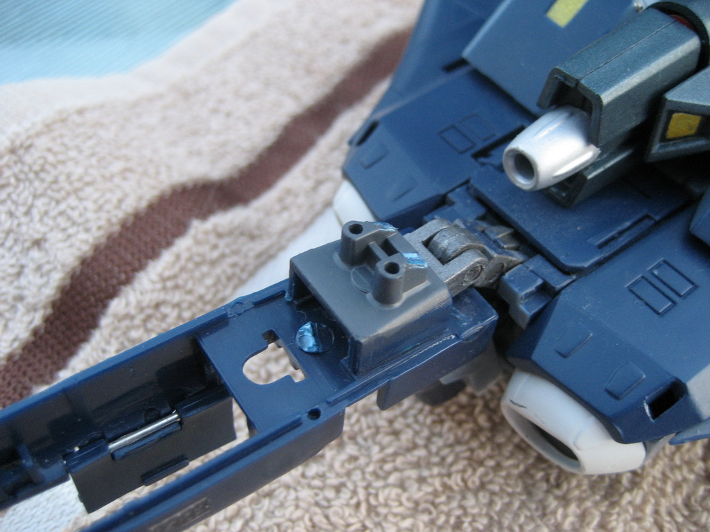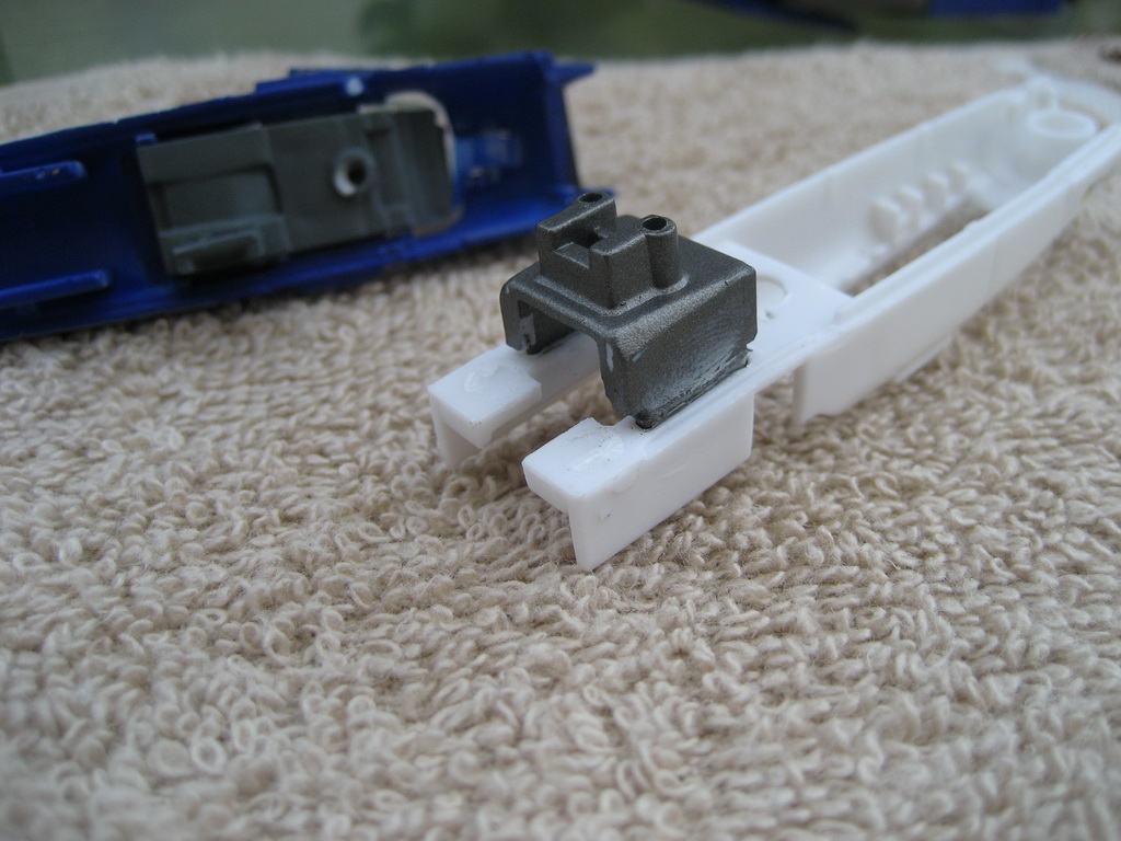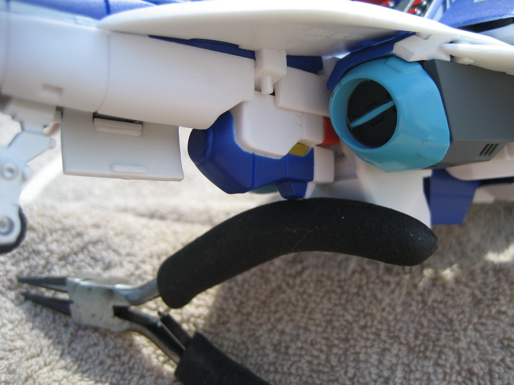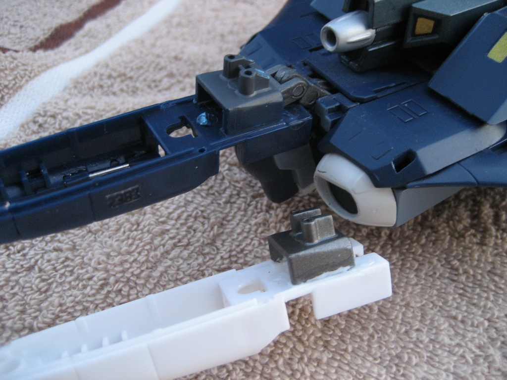 *** NOTE: par expérience, je me suis aperçu qu'il n'est pas nécessaire de chercher à trop plaquer le bloc gris, je conseille de faire des essais: Mettre la partie supérieure du cockpit, serrez avec les doigts et essayez d'ouvrir la verrière du cockpit pour tester: Elle doit s'ouvrir sans trop forcer et doit pouvoir rester ouverte. Si malgré que le bloc gris soit bien plaqué et que la verrière force pour s'ouvrir, alors vous pourriez avoir recours au rabotage qui existe sur les Toynami mais normalement, ce n'est pas nécessaire. ***
