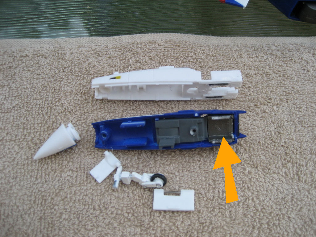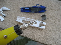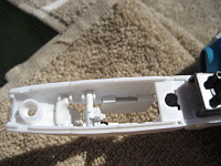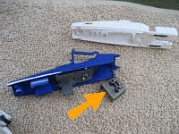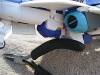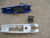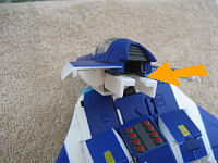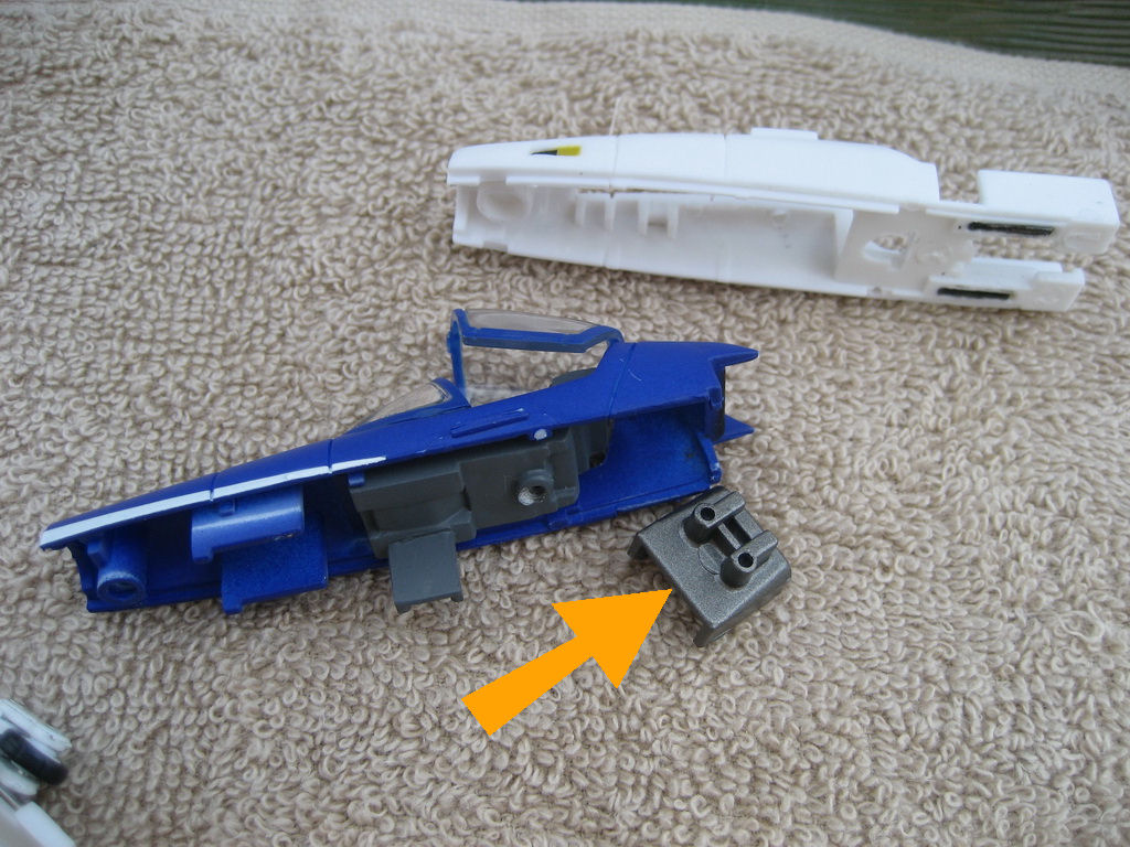 - N'ayant jamais constaté ce problème sur les alpha Fighter de Toynami, j'ai ouvert le dernier modèle de la gamme, le Shadow Fighter VFA-6X et on voit clairement que non seulement le bloc est bien plaqué sur la partie inférieur du cockpit mais qu'en plus il a subit une modification, un rabotage qui limite le frottement du blocage de la verrière en position ouverte et du même coup réduit la pression appliquée sur le bloc gris et par conséquence sur la partie inférieur du cockpit. On verra plus loin que ce n'est pas vraiment nécessaire. a noter que cette modif n'est pas présente sur les autres modèles (VFA-6H, Z, et I).