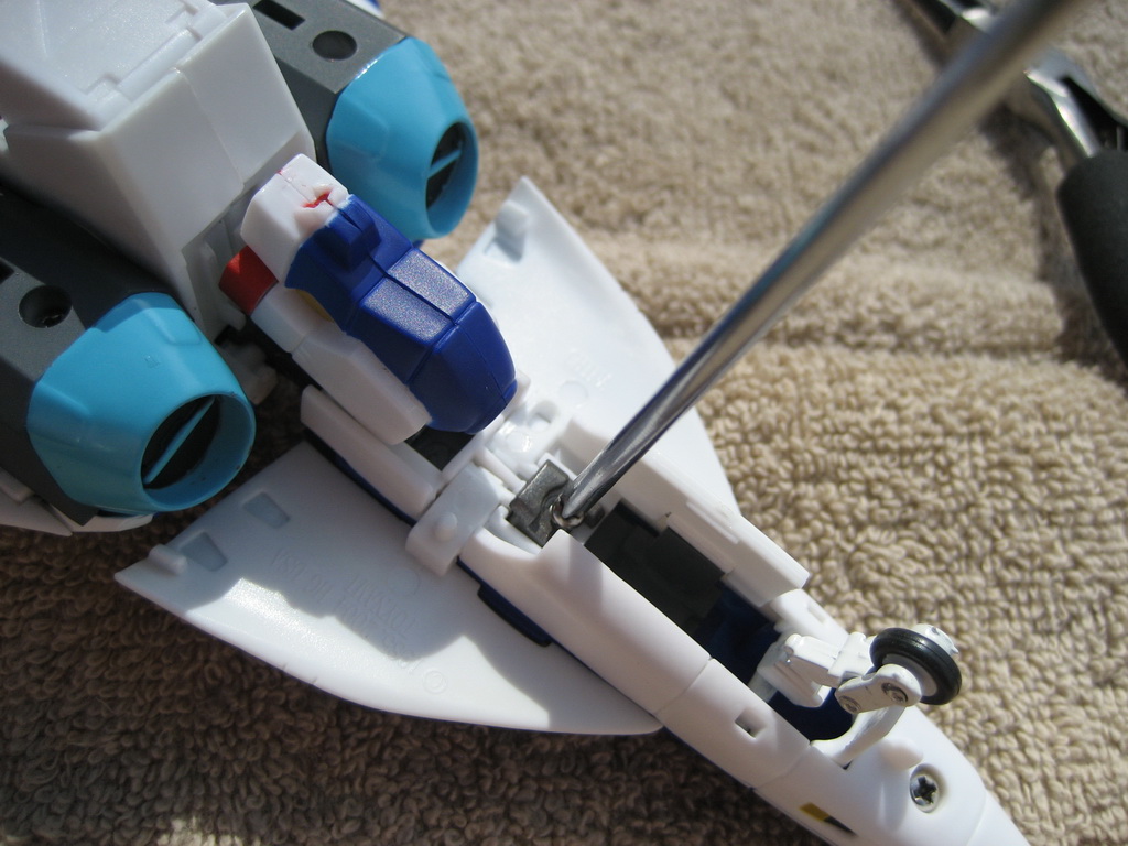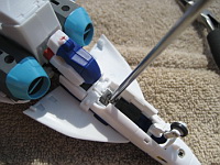 - Si vous avez ce problème, l'avant doit se détacher très facilement (d'où le problème...), s'il tient encore au reste du legioss, la procédure est la même. On passera donc directement au démontage du cockpit. Il y a 2 vis à retirer, la première entre les 2 ailettes (photo 1), ensuite on retire les ailettes et la cale grise (photo 2), et la seconde vis (photo 3). L'ensemble se détache facilement et sans forcer normalement.