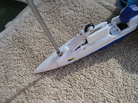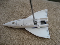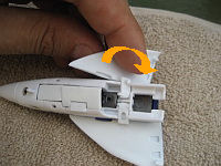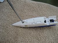 - On remet d'abord la trappe inférieure du train, la trappe avant, et le train d'atterrissage (photo 1). Ensuite mettez le cone en position en ajustant au mieux les couleurs (photo 2), assemblez le tout (photo 3).