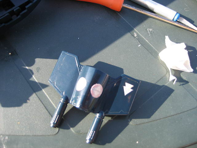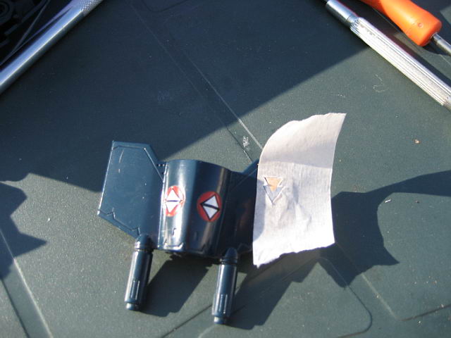 La partie la plus dure a été les 4 cotés des hanches. Des autocollants sont fournis avec le jouet mais bien entendu ils sont de la couleur du jouet d'origine. Après réflèxion, sans trouver de solution, j'ai fini à me résoudre à les peindre à la main.... Etant une calamité en dessin manuel, j'ai du m'y reprendre à plusieurs reprises pour finalement arriver à un résultat pas trop mal :-). Par ailleurs, le symbole Macross a lui aussi été repeind à la main...:-)