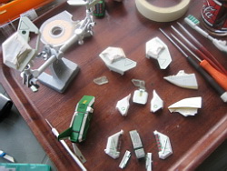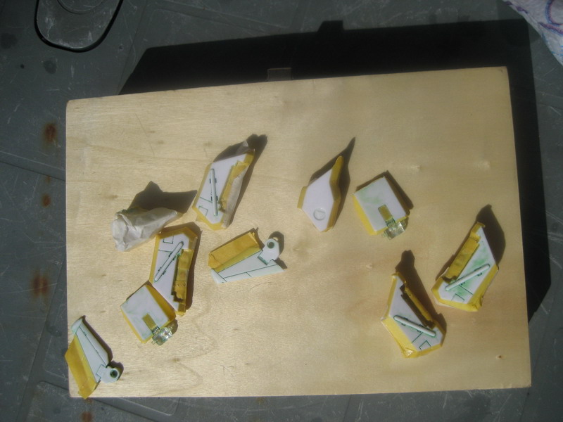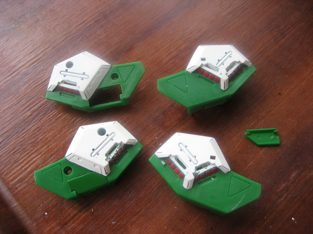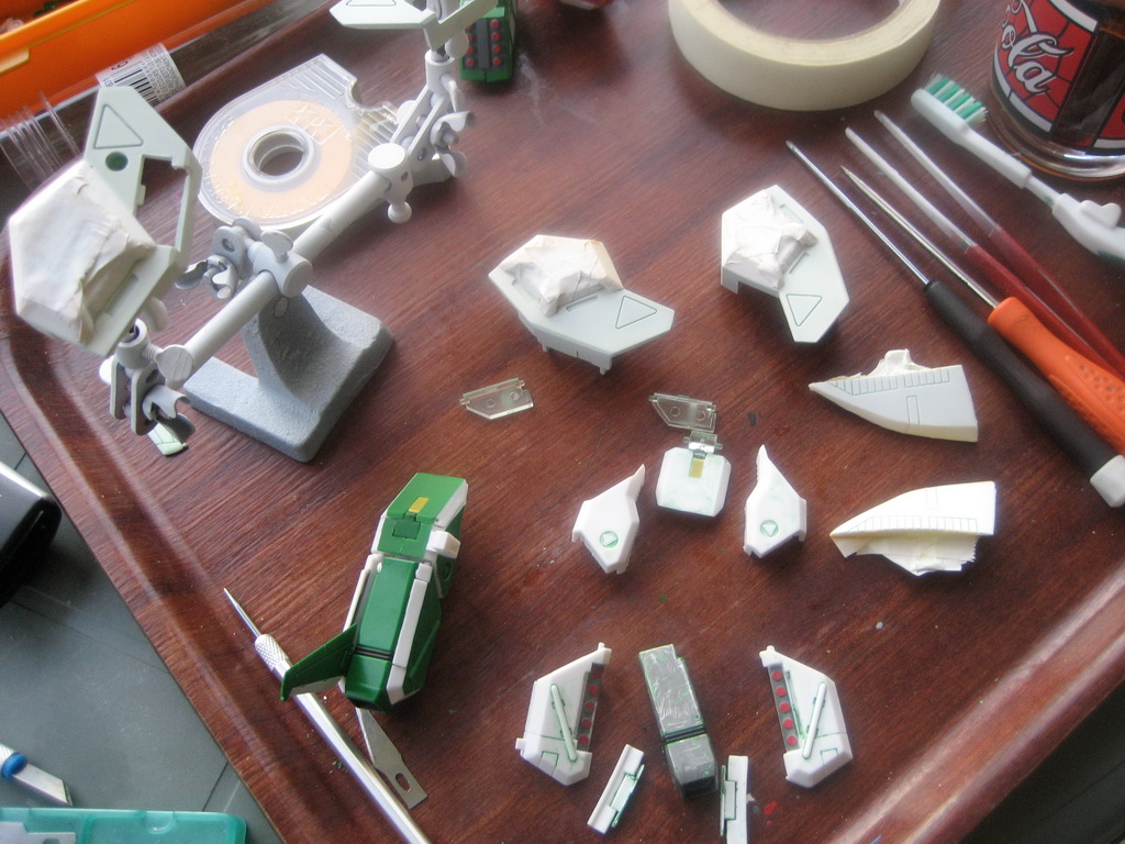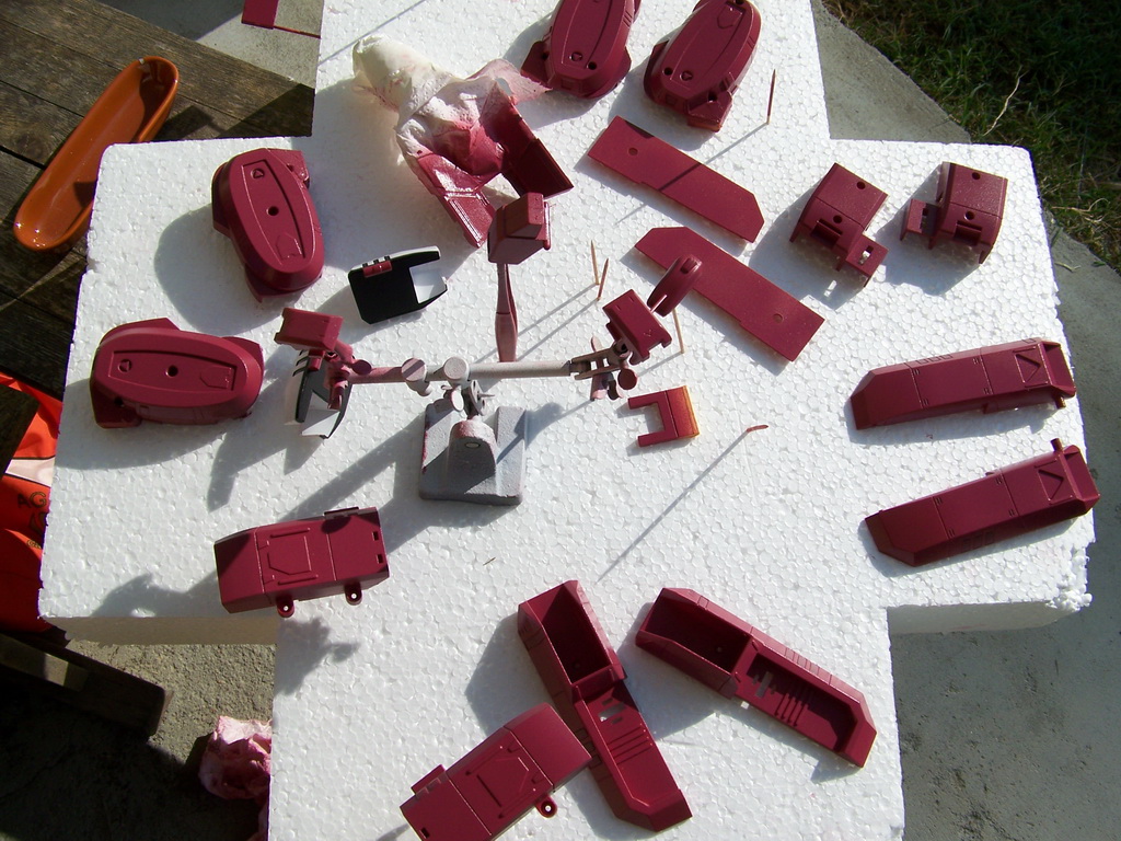 - J'ai décapé la peinture verte à l'alcool à brûler, simple à faire et rapide. J'ai apporté quelques améliorations car les Legioss, plus que les MPC, ont des défauts d'assemblages et il a fallu poncer et ajuster certaines parties. Ensuite la partie "masquage" qui est la moins agréable à faire car longue et fastidieuse...