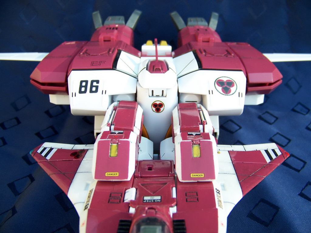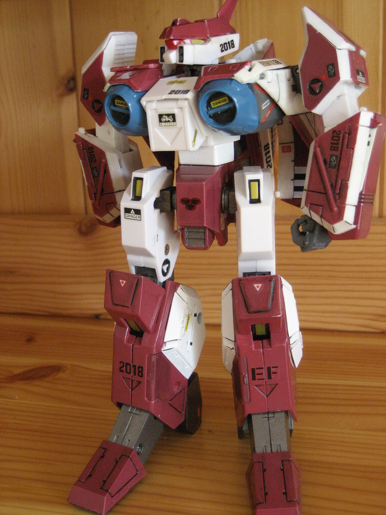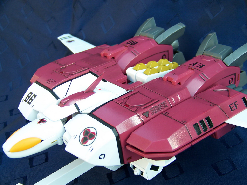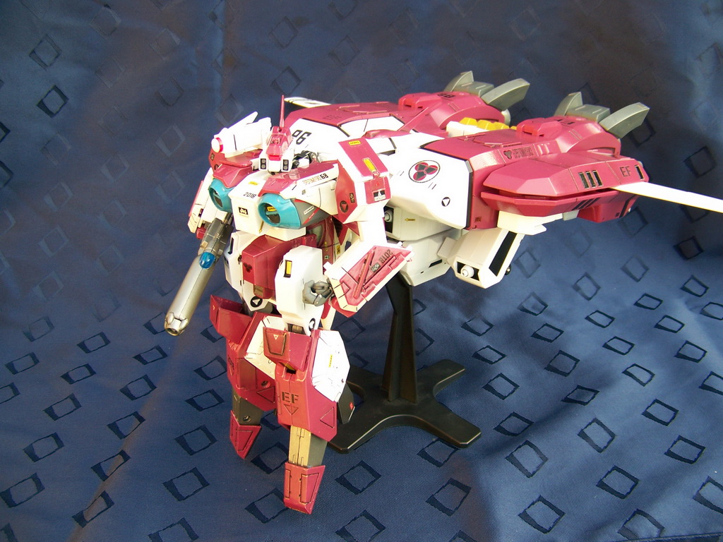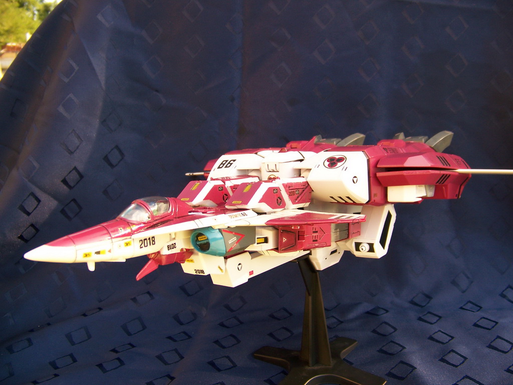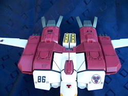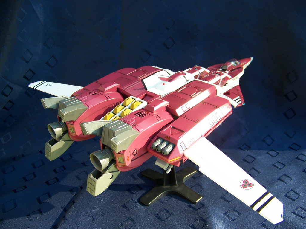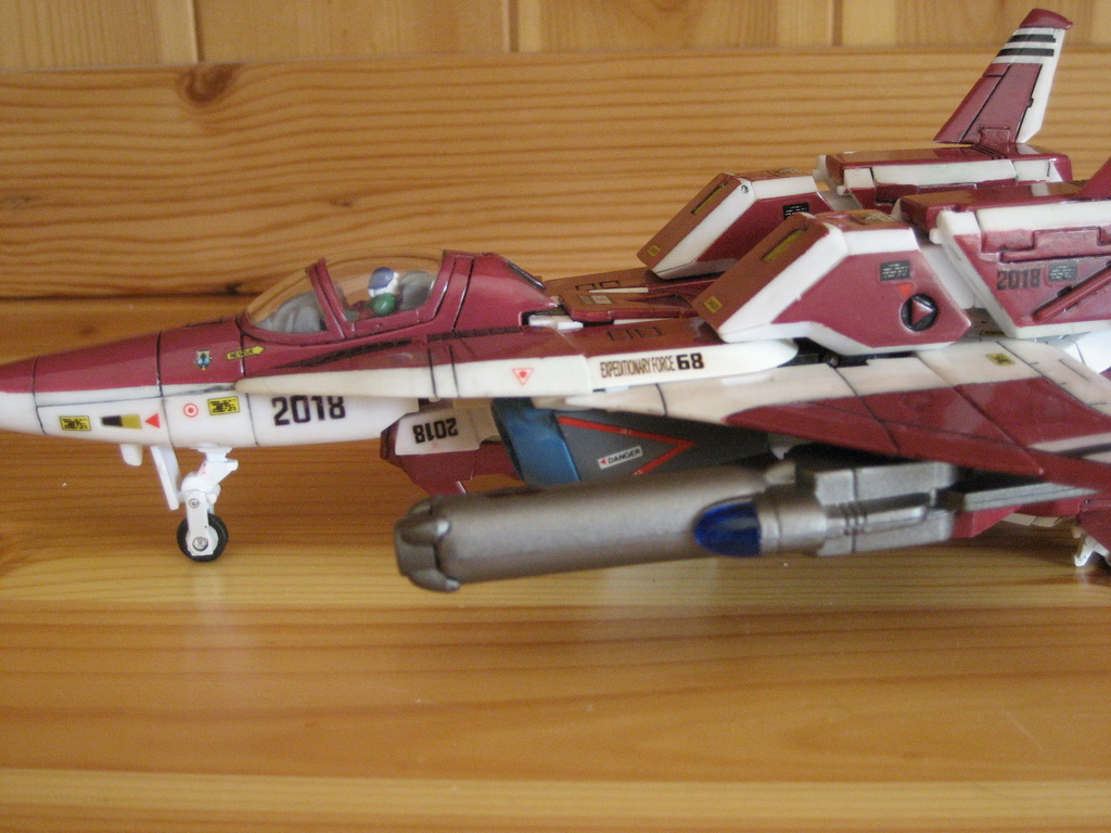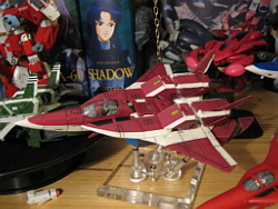 Rapide, il ne m'a fallu que quelques minutes pour le remonter. Là aussi il a fallu créer les décals spécifiques pour lui, j'ai passé du temps à faire plusieurs tailles (sur du papier d'abord) pour le logo et le chiffre qui sont sur les caches missiles avant car je voulais quelque chose d'intermédiaire entre ceux de Aoshima, très proche de l'anime mais trop gros à mon goût et les trop petits des MPC Beta Fighter. Sans prétention, j'en suis très fier, le résultat est exactement ce que j'espérais. Admirez !!! ;-)