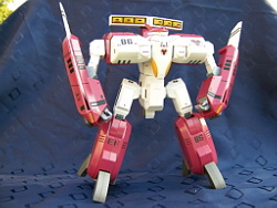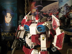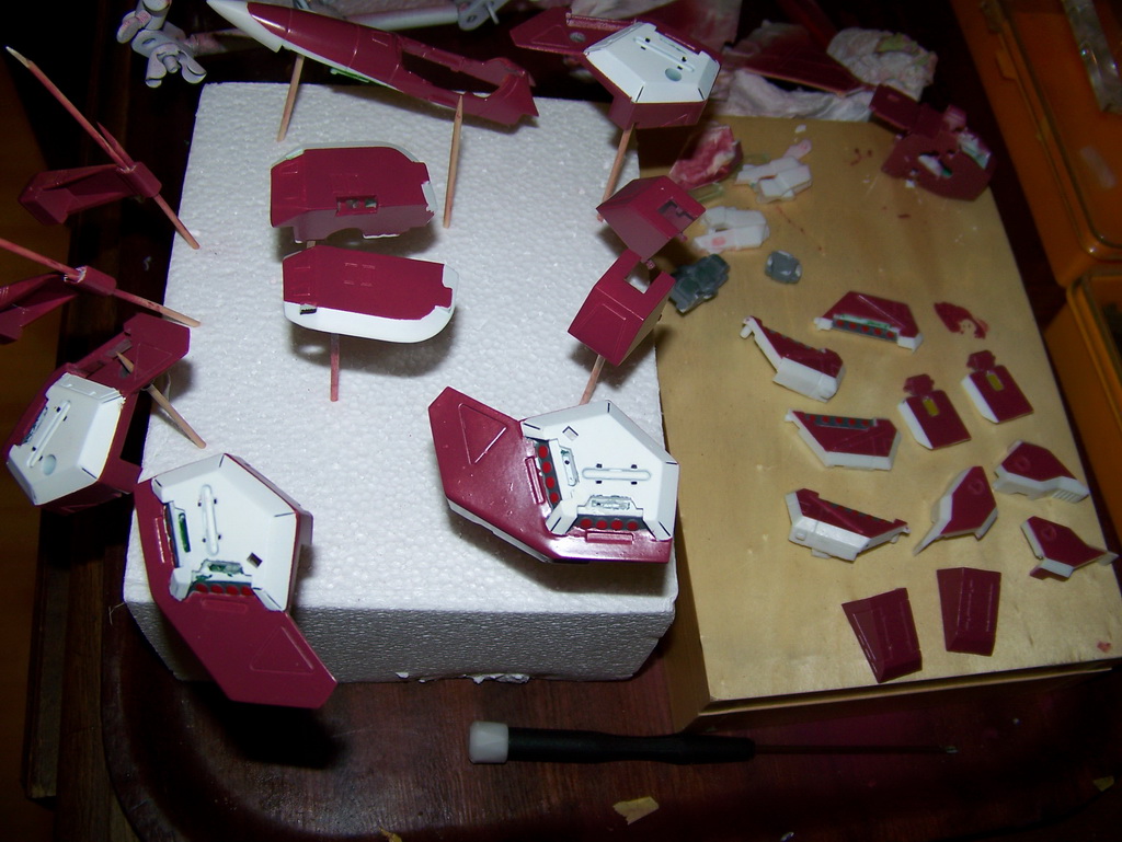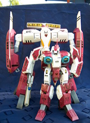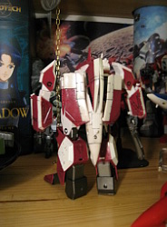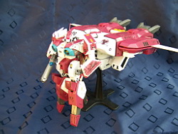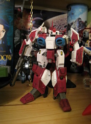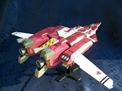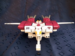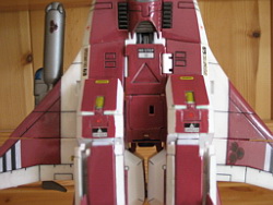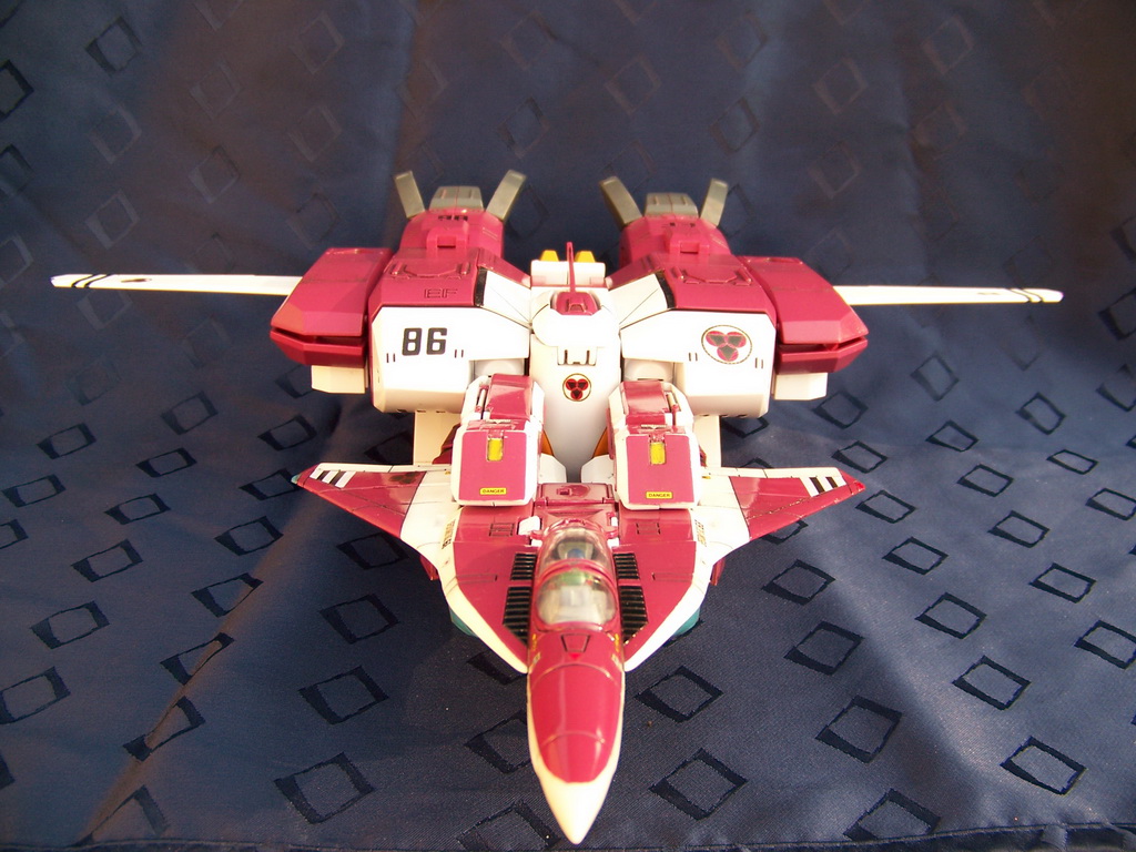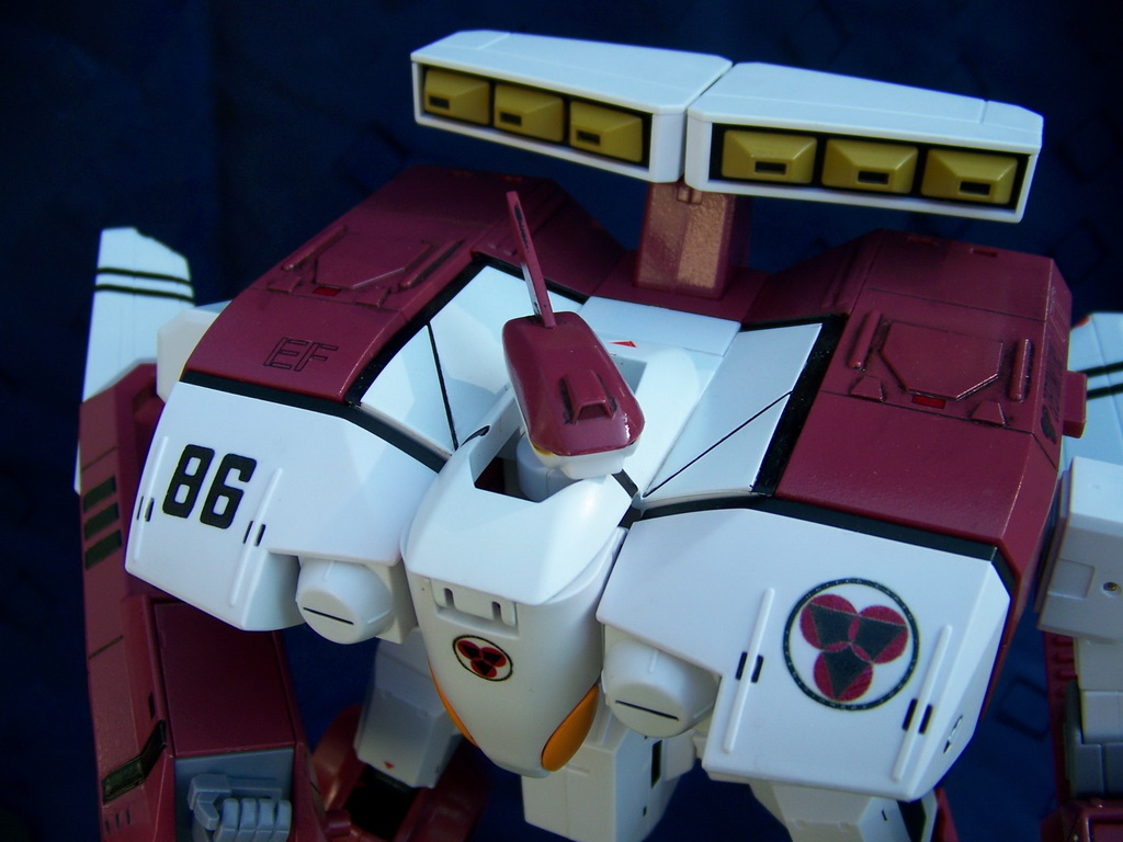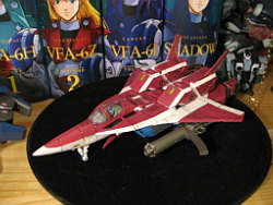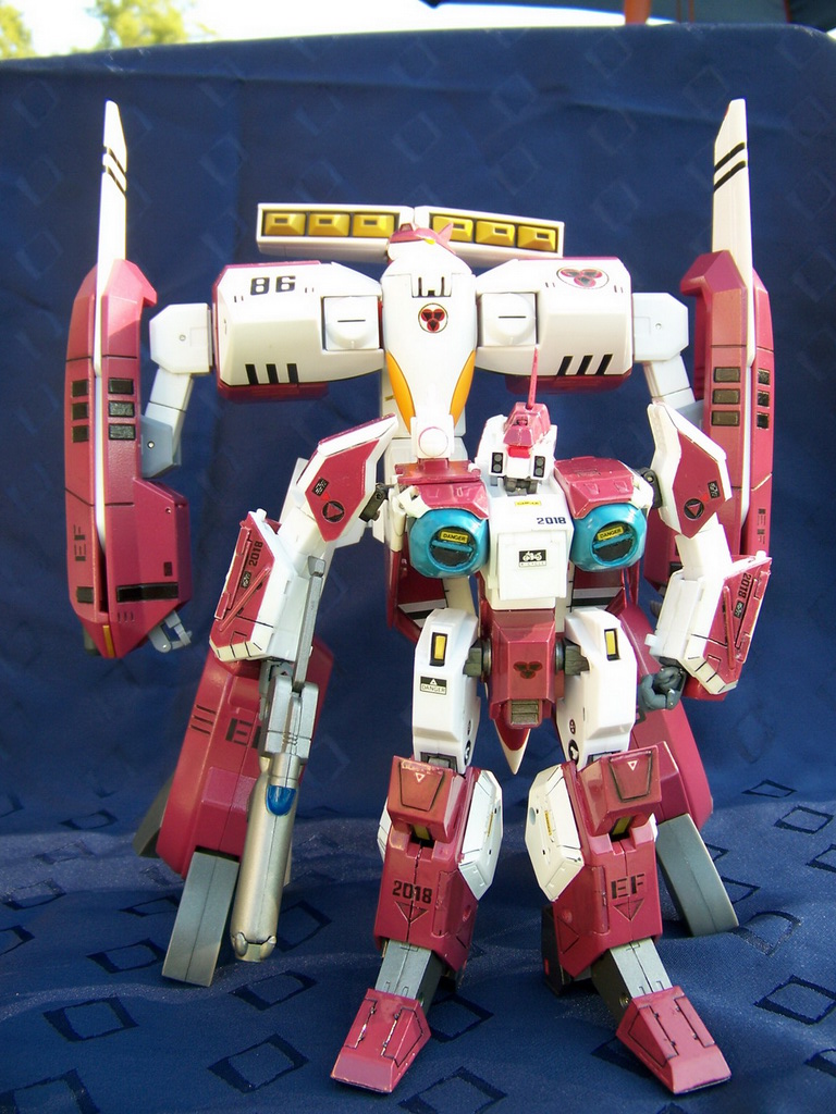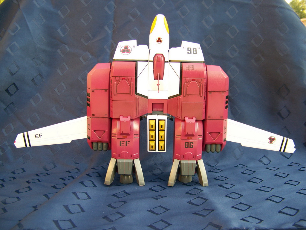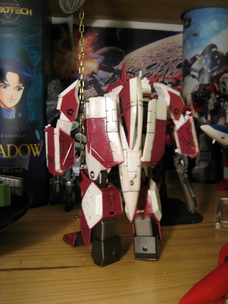 Rapide, il ne m'a fallu que quelques minutes pour le remonter. Là aussi il a fallu créer les décals spécifiques pour lui, j'ai passé du temps à faire plusieurs tailles (sur du papier d'abord) pour le logo et le chiffre qui sont sur les caches missiles avant car je voulais quelque chose d'intermédiaire entre ceux de Aoshima, très proche de l'anime mais trop gros à mon goût et les trop petits des MPC Beta Fighter. Sans prétention, j'en suis très fier, le résultat est exactement ce que j'espérais. Admirez !!! ;-)